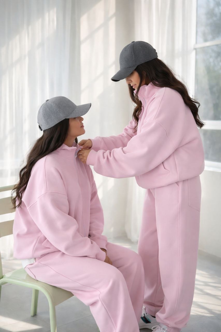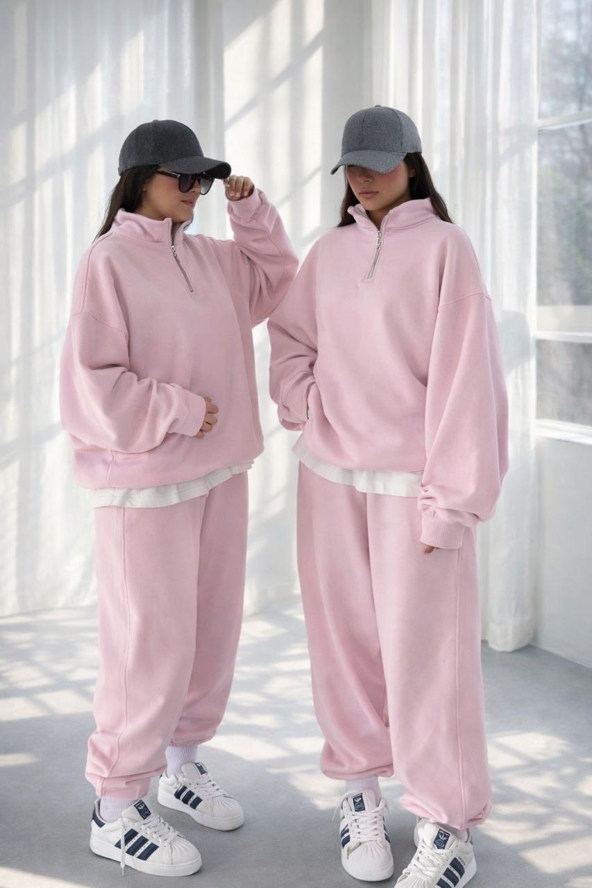 ست اسپرت دخترونه، ست راحتی زنانه، هودی نیمزیپ اورسایز و شلوار بگ/جاگر—ترکیب ترند ۲۰۲۵ برای استایل کژوال روزمره و دورهمی، با پارچه دورس لطیف و تنخور عالی 😍